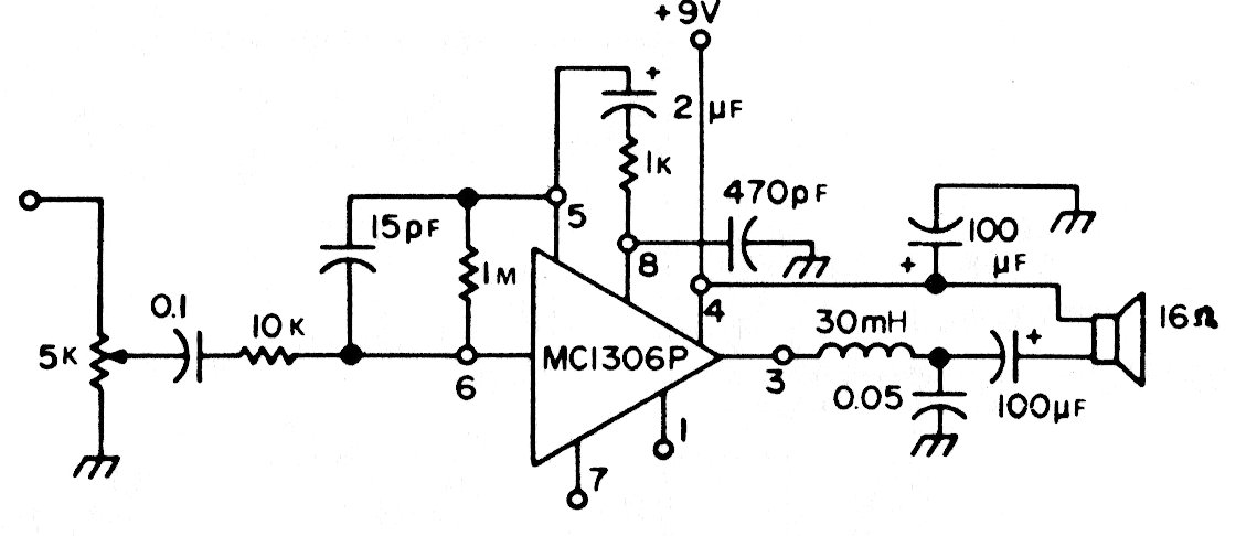 This amplifier uses a 1975 integrated circuit, which is uncommon today. The circuit has a gain of 30 dB and uses a transformer-less output with 9 V power.