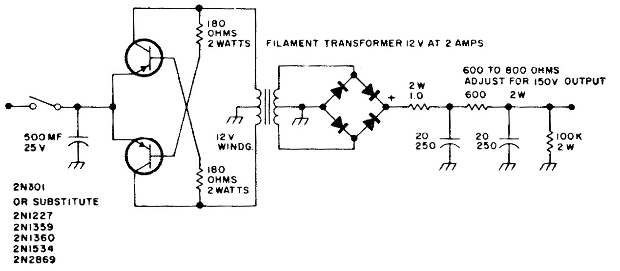This circuit provides a high voltage for supplying tube or other circuits from a 12 V battery. The transformer determines the performance, and the transistors admit more modern equivalents, since the original circuit is from 1975.