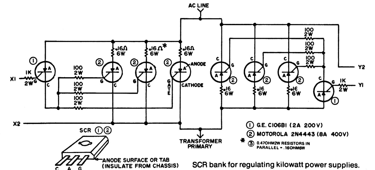 Found in an American publication from the 1980s, this circuit is designed to regulate the voltage of a 1 kW source. SCRs can be the modern equivalents of the 106 series that must be mounted on heatsinks.