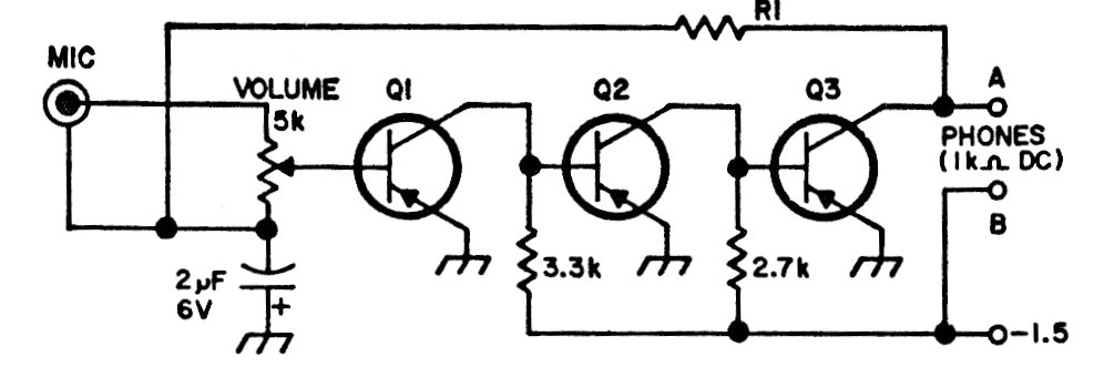 Applications for this circuit include hearing aid, stethoscope, etc. Transistors are general purpose and powered by a single 1.5 V battery.