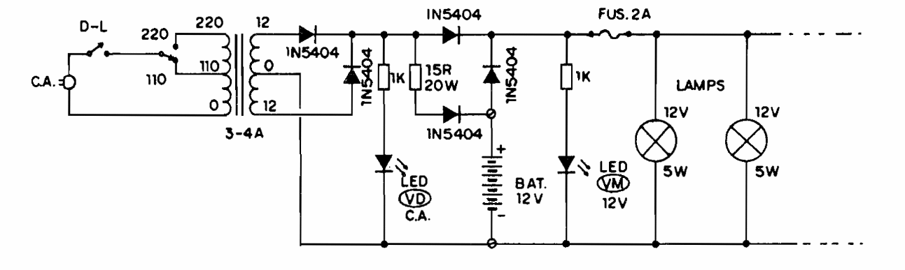 Found in old documentation as permanent security lighting, this circuit uses common components. The lamps can be replaced by fluorescent inverters or LEDs with appropriate series resistors.