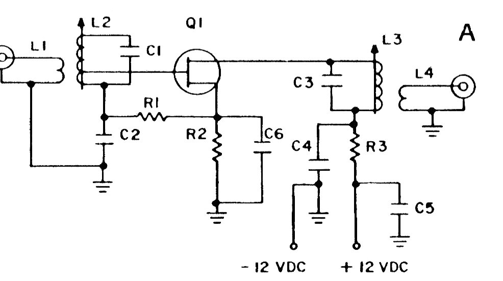 This circuit consists of an amplifier for signals from the FM band. We found it in an old documentation about RF circuits. The transistor can be a modern equivalent. C1 is 10 pF, C2 is 470 pF, C3 is 10 pF and C4 is 100 pF. R1 is 220 ohms, R2 is 370 ohms, R3 is 22 ohms.