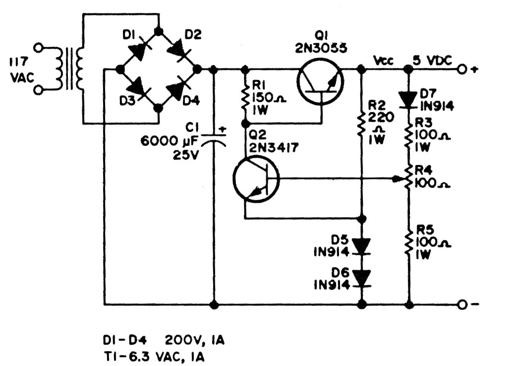 This 5 V power supply for TTL, Shields and microcontrollers is old, and the components can be replaced by modern equivalents. Transistor Q1 can be a TIP31 and Q2 can be a BD135.