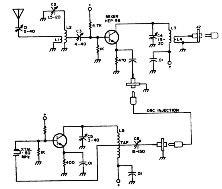 This circuit was found in American documentation from the 1980s. Its purpose is to use a 170 MHz communications receiver to receive signals in the 220 MHz band. The transistors used are high frequency RF (VHF) types.