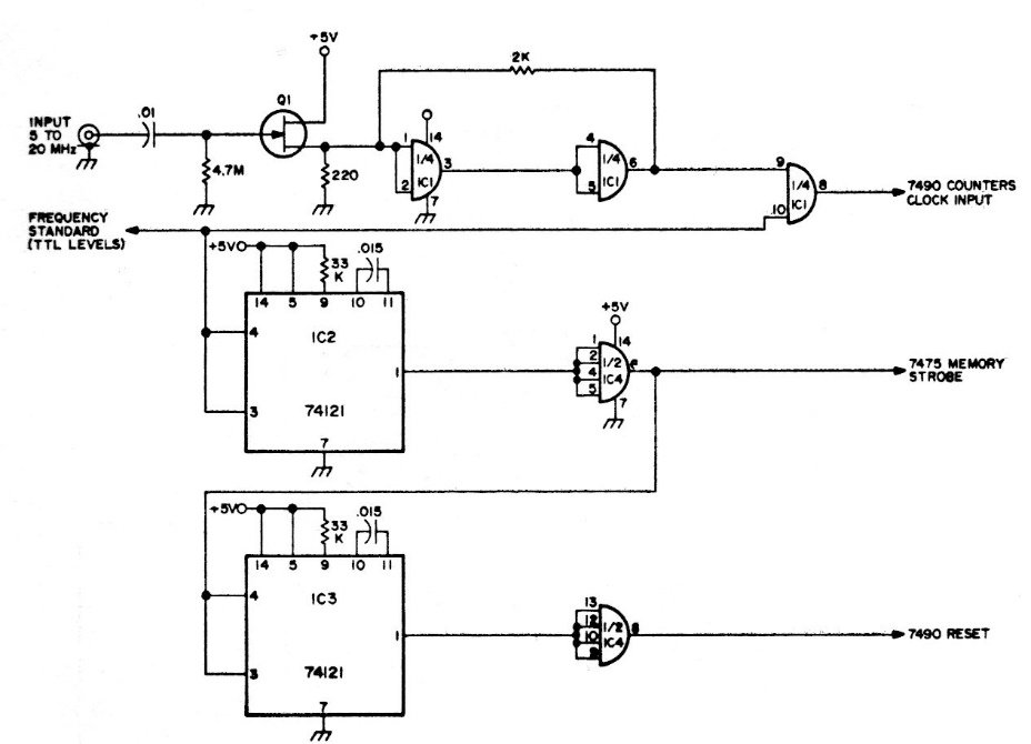 We found this circuit in documentation from the 1980s. It is an input stage for a digital frequency meter. The circuit can operate with signals up to a few tens of megahertz.