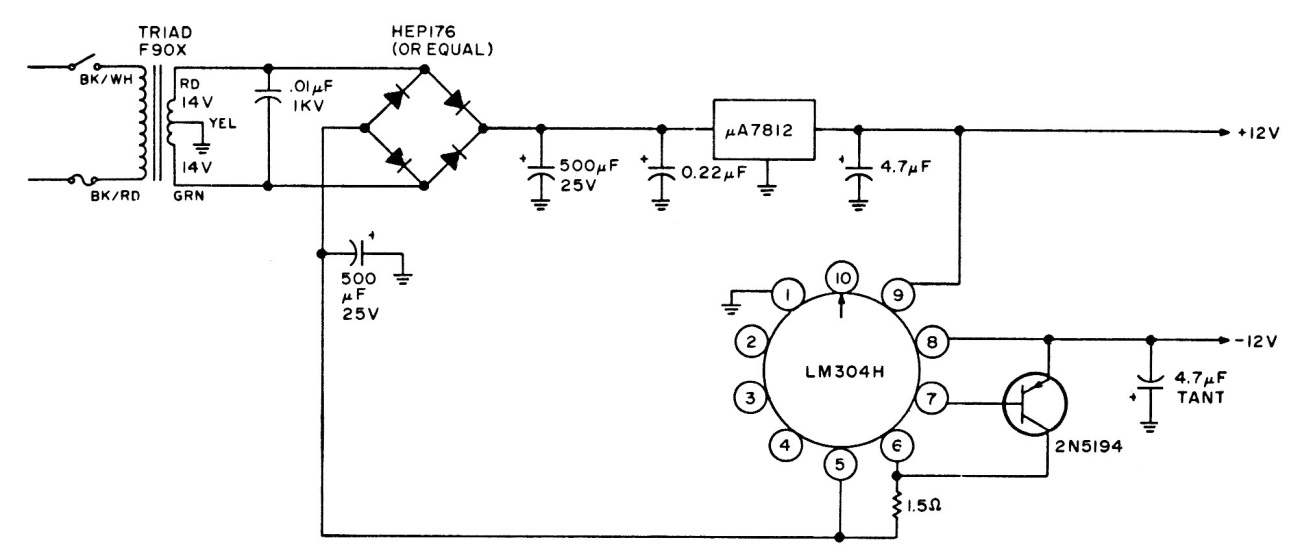 This circuit uses a 7812 and another regulator integrated circuit that is not very common nowadays. The same configuration can be adapted to use a 7912 which is the negative pair of the 7812. The 7812 must have a heatsink. The transistor can be a TIP31 if the original configuration is adopted.