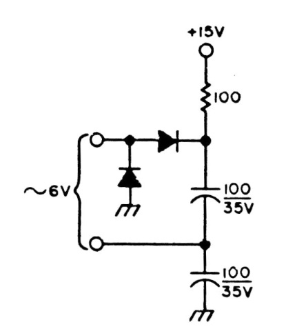 An input voltage of 6 V rms produces an output voltage of 15 V in this doubler circuit that doubles the peak voltage value. The current is low, and the diodes can be 1N4002 in this application. The circuit works with other voltages.