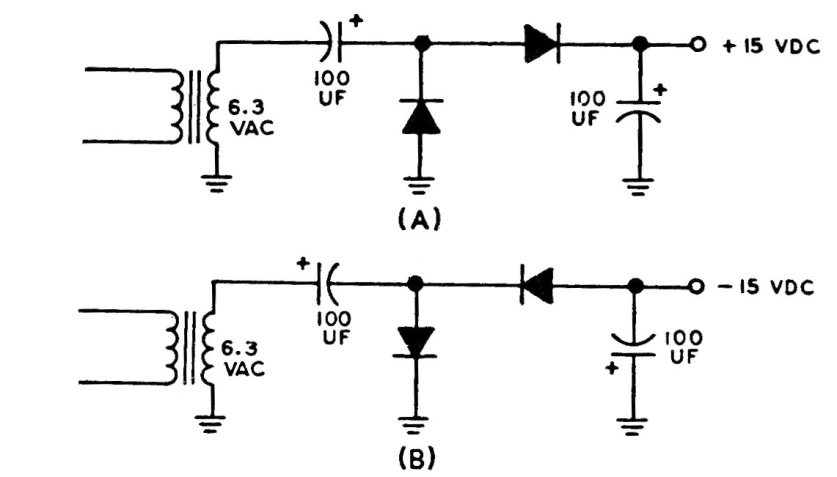 This symmetrical power supply uses two old filament transformers. The circuit was obtained in a documentation from the 80's and the diodes can be 1N4002.