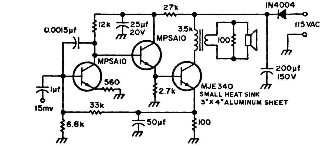 This audio amplifier from the 70's uses a high voltage transistor. The transistors are from the era and the power is 2.5 W. The circuit is from an application note from Motorola at the time.