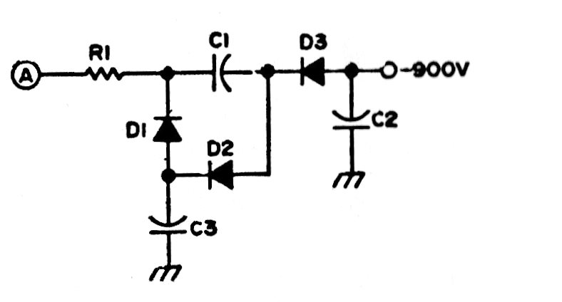 This is the typical configuration for a high voltage triplicator. The configuration can be used with low voltages with components of appropriate values according to the desired voltage. Capacitors can typically range from 1 uF to 100 uF.