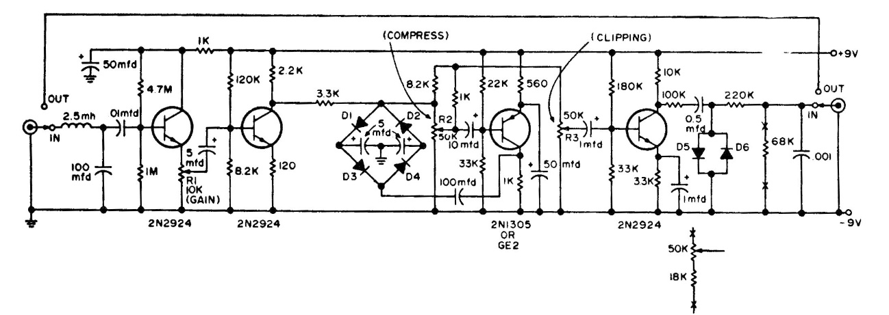 This circuit processes the audio signal that corresponds to a word to make it more appropriate to modulate a transmitting system. The circuit is a documentation for radio amateurs of the 70s.