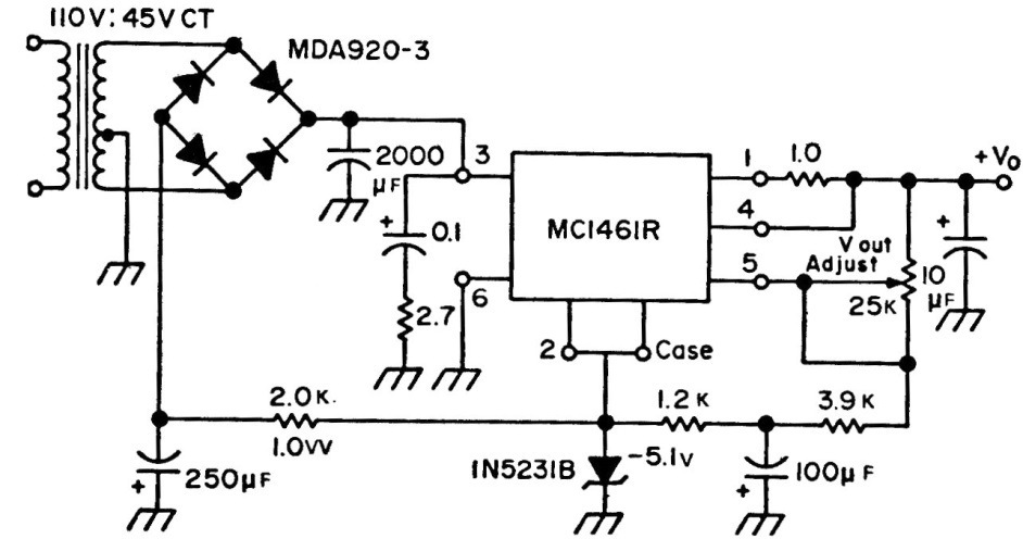 This circuit is from old American documentation, using a regulator integrated circuit that is uncommon today. The diodes can be 1N4002 and the transformer has a 500mA secondary.