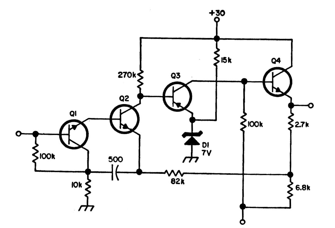The operating range of this circuit ranges from 0.5 to 2 MHz and its gain is 11dB. Transistors can be of general use. We found this circuit in an 80's documentation. The input impedance is 32M ohms.