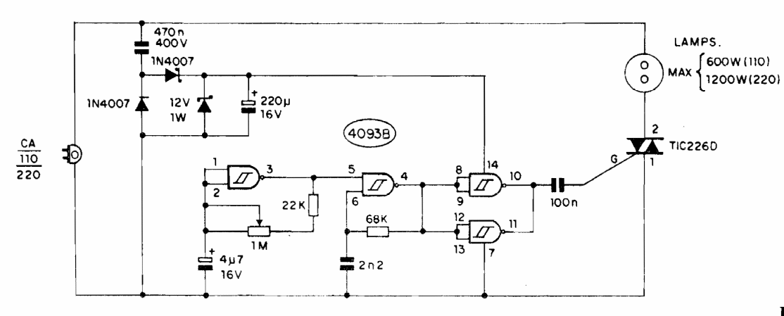 This old circuit is suitable for signaling applications. The lamp must be incandescent, and the triac must be mounted on a heat sink. The frequency is adjusted in the 1 M trimpot.