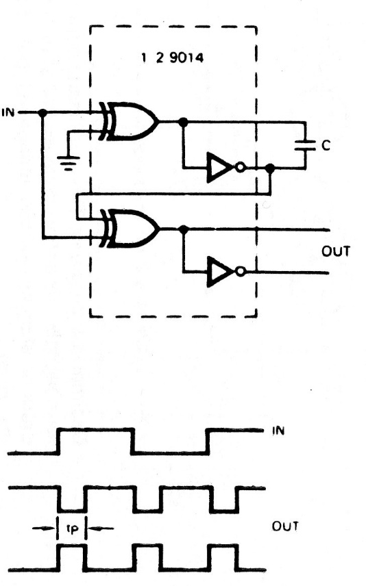 The integrated circuit used in this application is not currently common. However, it can be implemented with the same separate functions. The circuit is from an old documentation and must be powered with 5 V, and the pulse times depend on C.