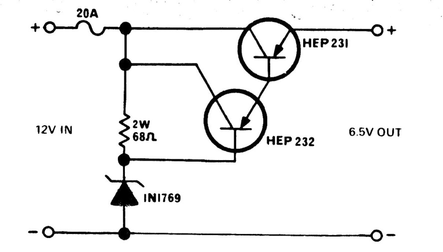 This circuit is from an old American documentation and its use in motorcycles with 12 V is suggested to power 6V radios. The transistor can be the BD136 and BC548.