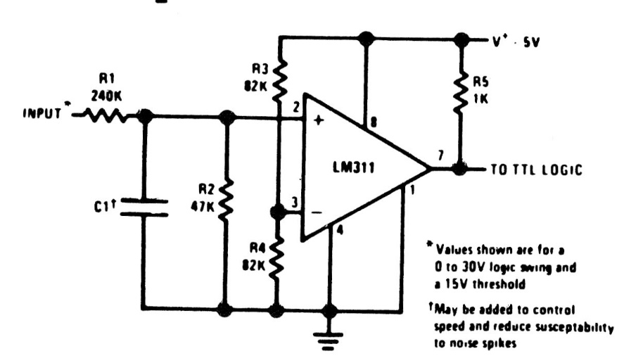 This TTL shield with high level logic is from the LM111's own 80's manual. The integrated circuit is no longer easily found, but the circuit can be adapted to use modern equivalent operational amplifiers.