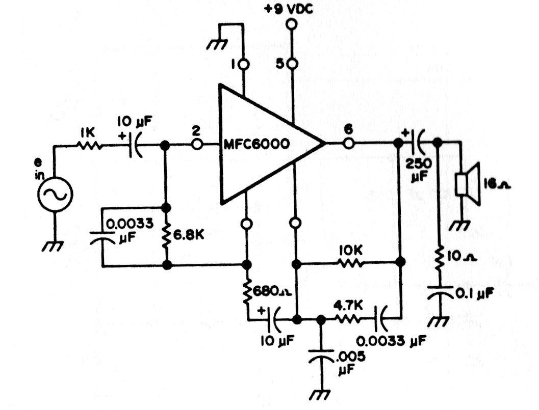This small audio amplifier was found in an American publication in 1975, The integrated circuit used is rare today. The circuit was used in portable receivers of the time and other applications.