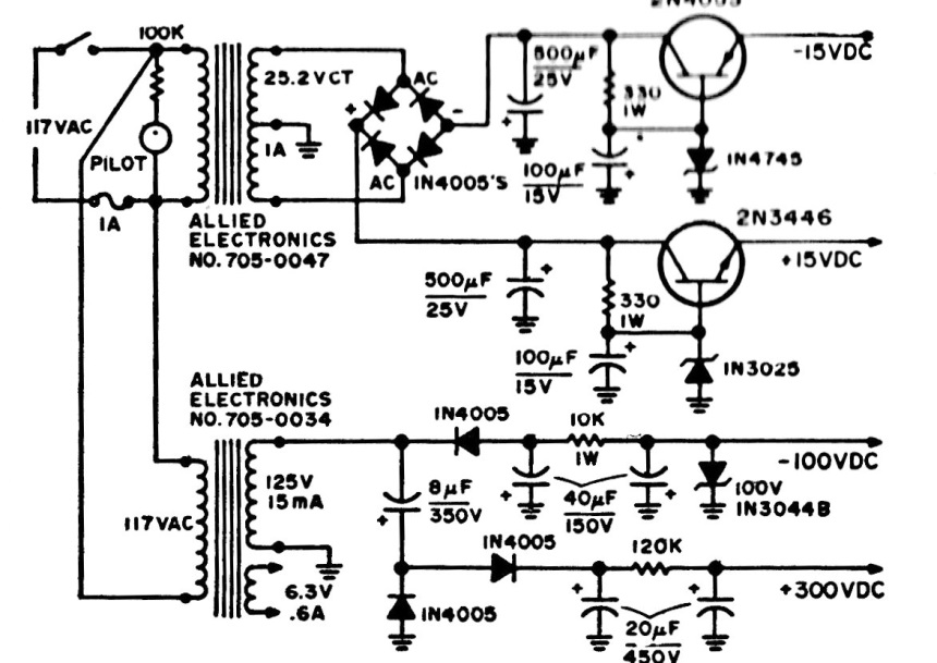 This multi-purpose power supply provides voltages of +15, -15, 300 and 1 000 V and is very useful on the bench. The components must have specifications according to the voltage of the sector in which they work.