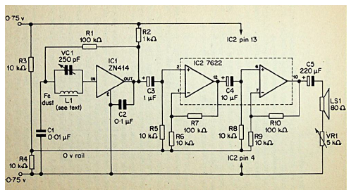 This circuit is more elaborate than the previous one, employing an integrated amplifier circuit of the time. The circuit is from 1991.