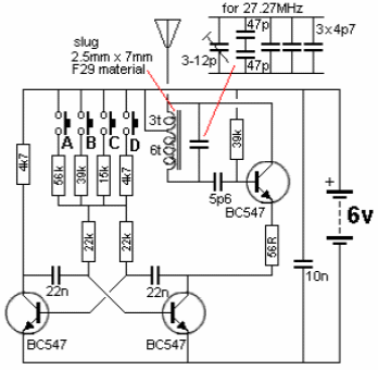 This tone-modulated transmitter was found in recent English documentation. The circuit operates in the 27 MHz band and the range is a few tens of meters, depending on the sensitivity of the receiver.