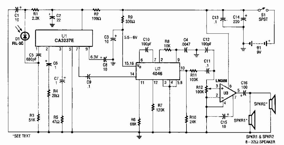 This circuit is from a Popular Electronics from the 90's. The audio amplifier admits equivalent. The others integrated are not very common today.