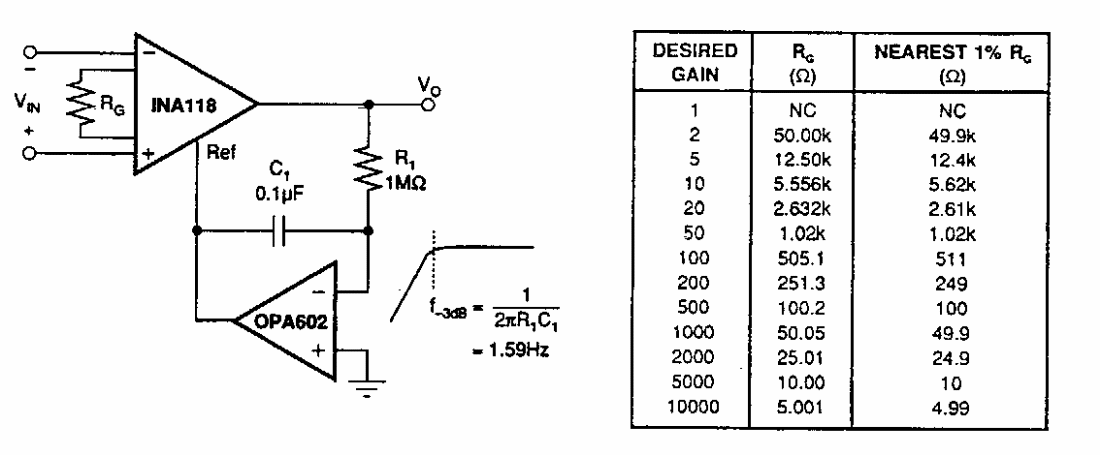This amplifier was found in Burr-Brown documentation from the 90's. The gain can be programmed by resistor Rg as per the table given in the diagram. The power supply must be symmetrical.