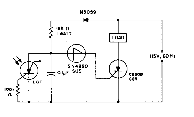 This circuit uses a photo-SCR or LASCR that is not a common component today. The relay depends on the load, and the power is supplied by the power grid.
