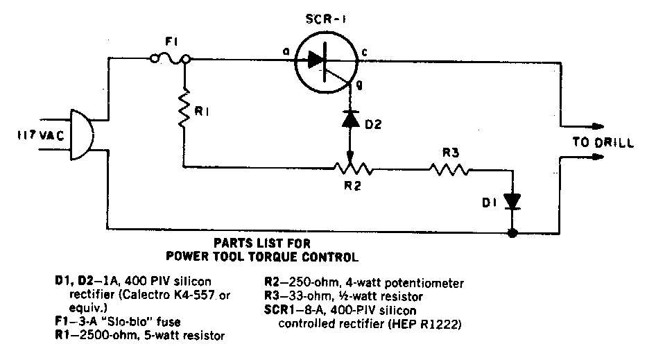 Found in American documentation from the 1970s, this circuit can be designed based on a modern SCR, such as the TIC106. The SCR must be provided with a heat sink.