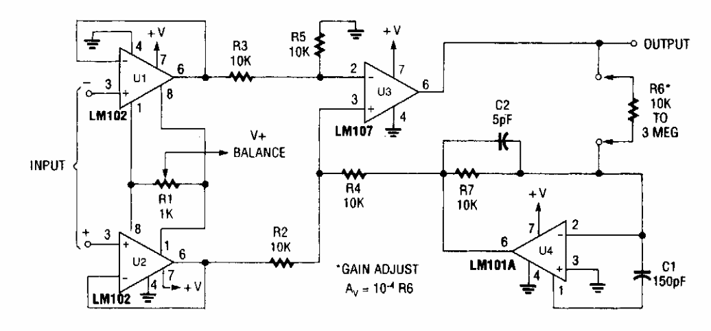 Found in Popular Electronics from the 90s, this amplifier uses components from the time. The circuit has differential inputs.