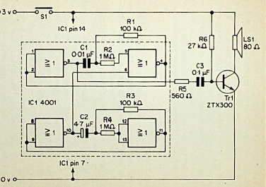 This two-tone buzzer can be powered by a solar panel. The circuit is from a 1991 documentation. The transistor is a general-purpose type.