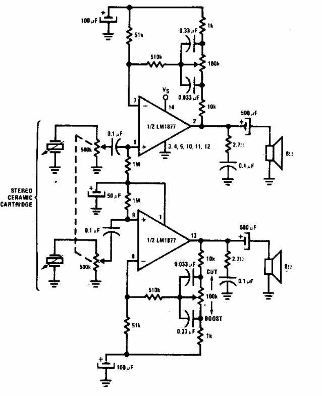 Using an old integrated circuit, this low power amplifier, on the order of a few watts, includes tone control. The circuit can serve as a basis for projects with more modern integrated.