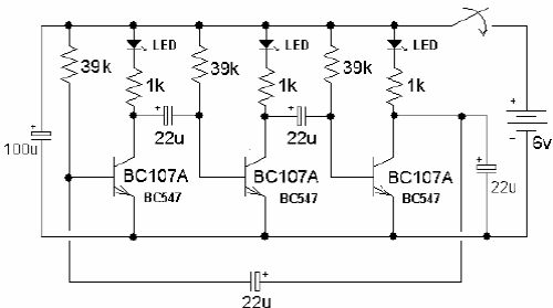 This configuration appears on our website obtained from several sources. This is from English documentation and makes use of BC107 transistors, but which can be replaced by the modern version the BC547 and even BC548. The frequency of the effect is given by the capacitors.