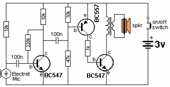 This small amplifier with 3 transistors can be used both as a stethoscope and as a spy. The circuit uses a small output transformer of the type found in old transistor radios.