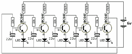 This circuit operates according to the same principle as the previous one, but it has a difference in the way the LEDs are excited. In it, the LEDs are connected to the emitter of each transistor.