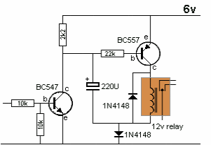 With this circuit it is possible to activate a 12 V relay from a 6 V supply. The circuit operates as a voltage doubler and takes advantage of the lower maintenance voltage of these relays. We found it in old American documentation. The circuit can act as a shield.