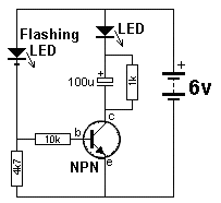 This circuit takes advantage of an LED that has the flasher built into the chip to control a second common LED so that it also flashes. The circuit is from an American publication and the transistor can be of any type of general use.