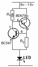 This simple circuit supplies a constant current to an LED from supplies that can vary between 6 and 12 V. For a 56-ohm resistor like R2 the current will be 10 mA.