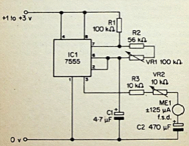 This very low consumption circuit can be powered by a solar cell. The time indication is given by a microammeter.
