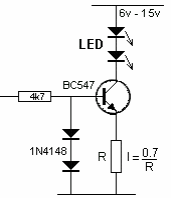 In the figure we have a variation of the previous circuit with only one transistor, using the reference of two diodes. The circuit can keep the current in LEDs constant even when the voltage varies in the range of 6 to 15 V. The circuit is from American documentation.
