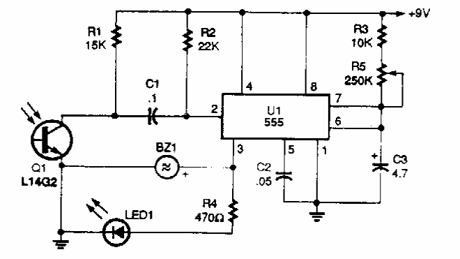 This circuit is the receiver for the previous transmitter modulated by an audio signal. The transducer is a ceramic capsule, in which case the circuit becomes ideal for telegraphic transmissions.