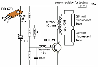 This circuit was found in a recent English publication, making use of a power transistor that admits equivalent as the TIP42. The transistor must be provided with a heatsink. The inverter can power a 12 W lamp or two 6 W lamps from the car battery.