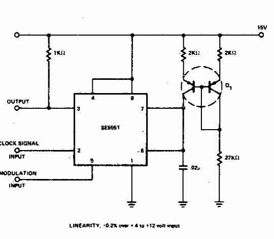 This linear modulator was found in old documentation. The integrated circuit used is uncommon today, as well as the double transistor that consists of a matched pair.