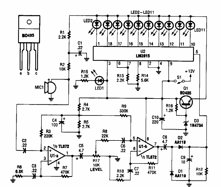 This sound meter or sonometer was found in a Popular Electronics from the 80's. The circuit can be easily implemented today, and the microphone is made of electret or ceramic.