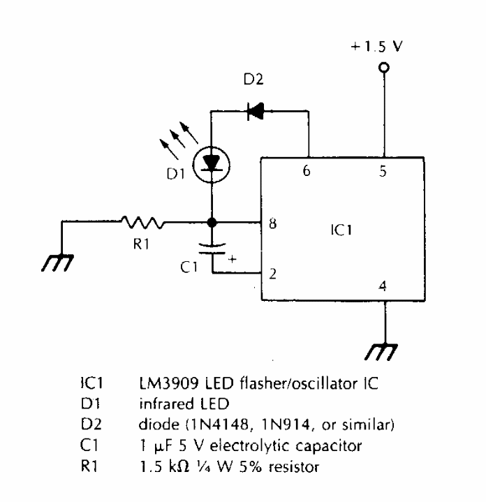This simple very low power circuit can be used in a battery powered infrared tone trigger. We found it in an American documentation from the 90s.