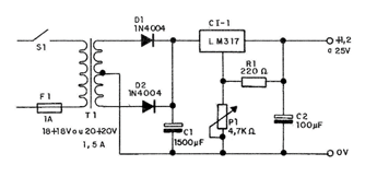 This project is of great use as it serves both to feed test equipment as well as to the component testers that we describe in this book. The base of the circuit is an integrated voltage regulator LM317 that can supply output voltages from 1.2 to 25 Volts, adjusted in a potentiometer on this source.