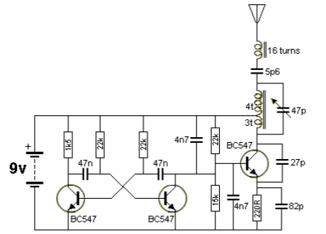This circuit is suitable for applications with short-range remote control. The emitted tone is used for remote activation. The tuning is done in a trimmer and the smaller capacitors must be ceramic.