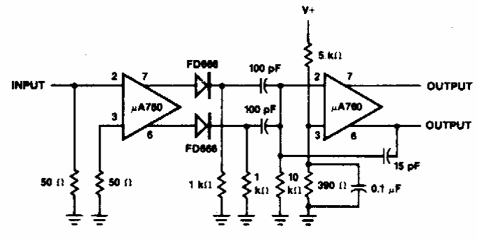 This type of circuit, found in American documentation from the 1980s, triggers producing output pulses when the input voltage goes through zero. The circuit can operate with frequencies from 300 Hz to 3 MHz and the maximum input voltage is 20 mV.