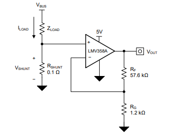 This current sensor employs the Texas Instruments LMV358A low voltage operational amplifier. This low voltage amplifier can be used in control shields, being the circuit obtained in the component's datasheet.