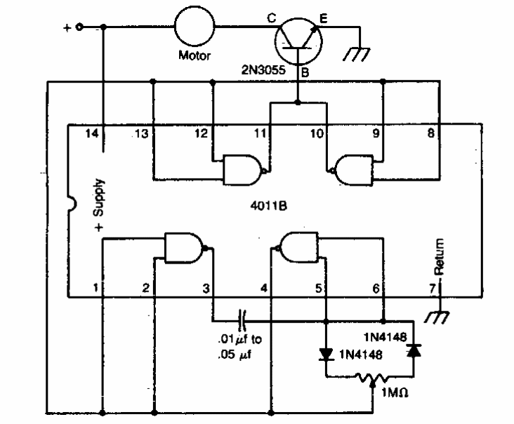 This simple PWM control was found in American documentation. We can use any power transistor according to the controlled motor. It may be interesting to connect a 220-ohm resistor at 1k in series with the base of the transistor.
